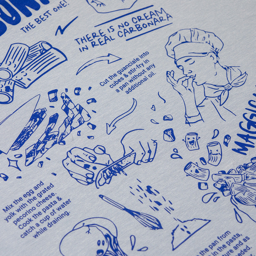 Gegen Sahne. Für alle, die wissen, wie echte Carbonara schmeckt. Direkt aus Roma, in römischem Dialekt. 100 % Baumwolle, 155 g/m² leichten Stoff – made for people, die Guanciale buchstabieren können.