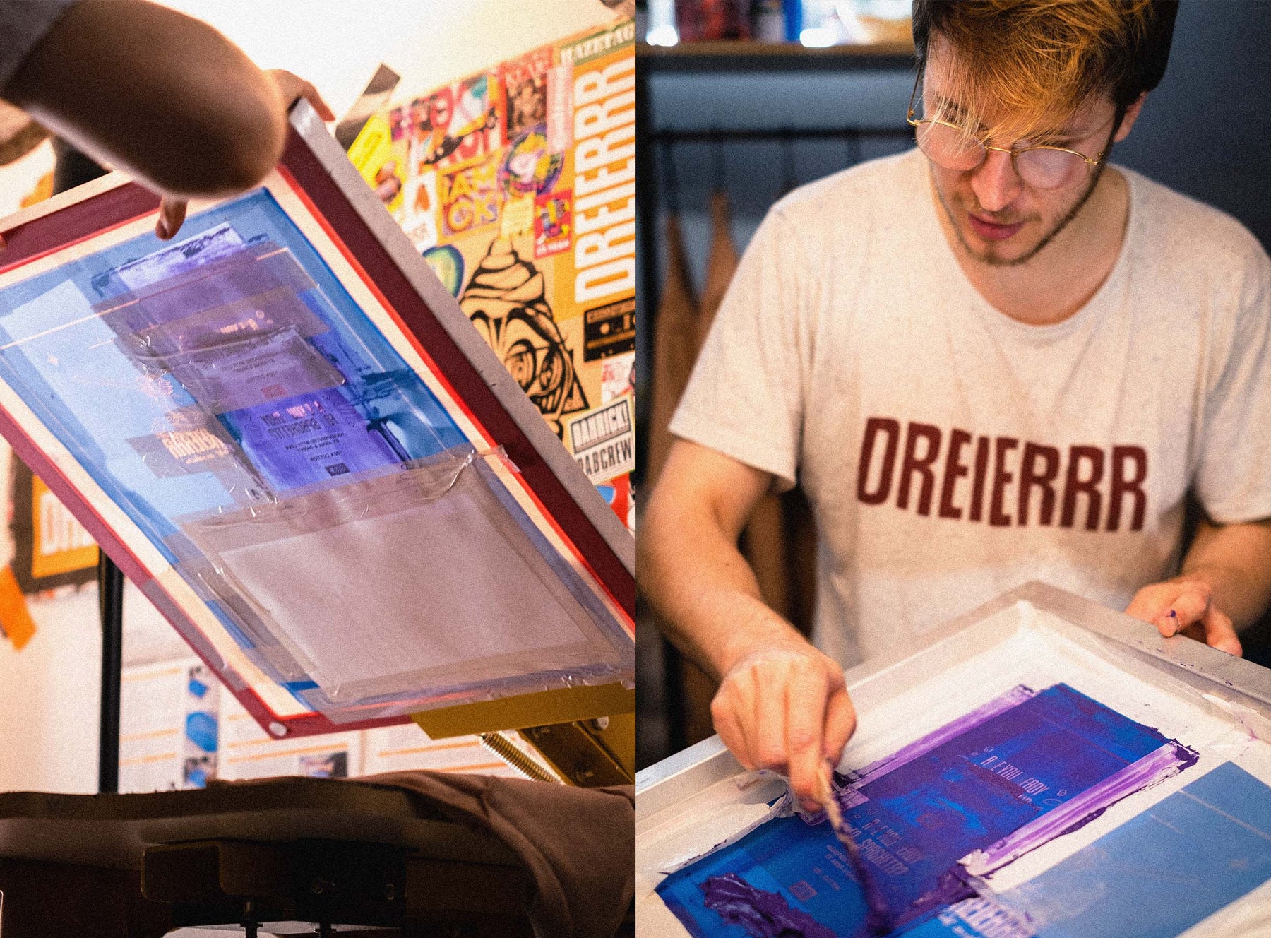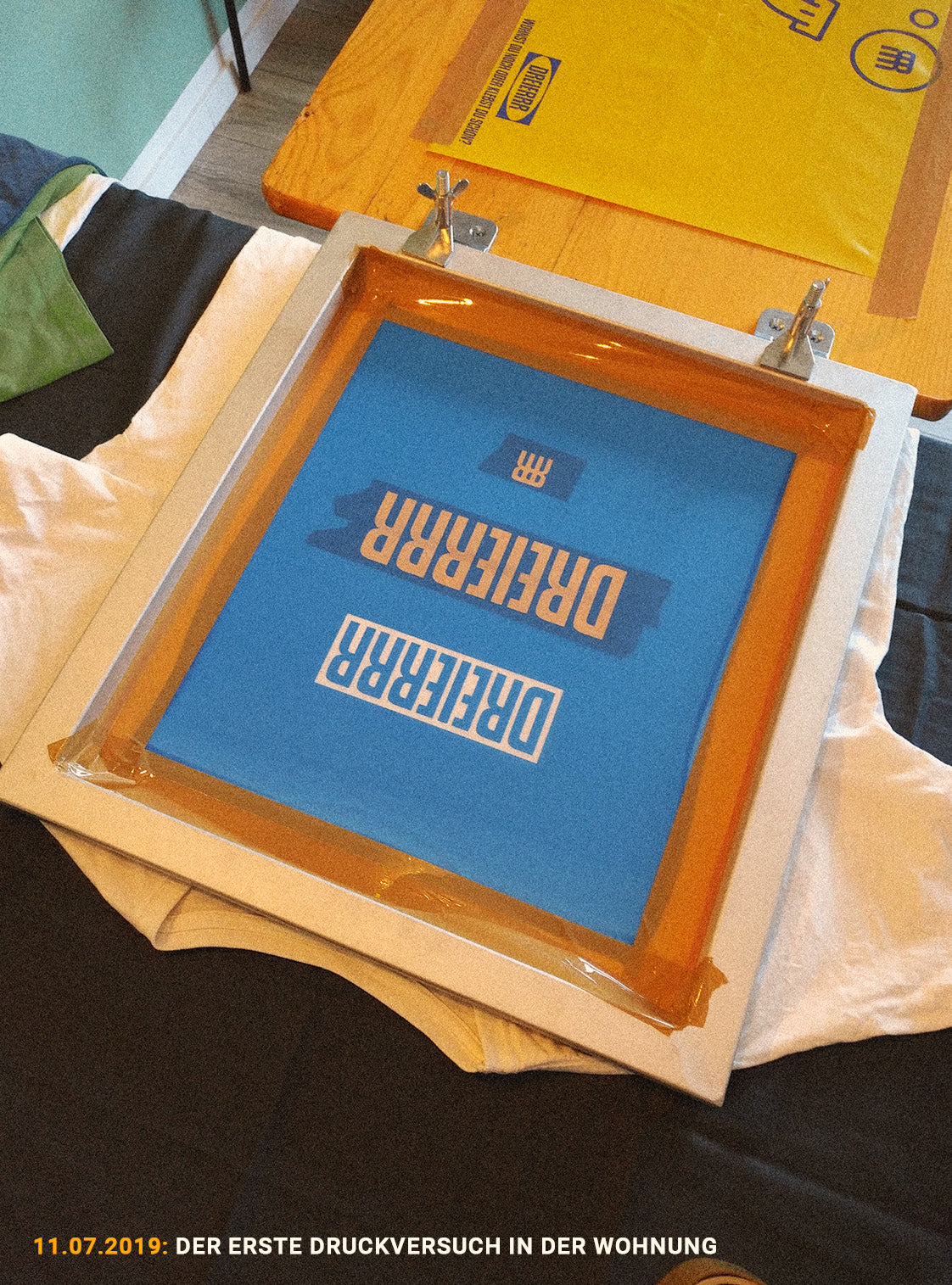 Ich entschloss mich die bereits gegründete Firma „DREIERRR“ von da an allein weiterzuführen und steckte noch mehr Zeit, Energie und Liebe in die ganze Sache. Als ich zufällig Videos über Siebdruck auf YouTube gesehen habe, dachte ich mir: Das wäre doch eine tolle Möglichkeit, um flexibel eigene Shirts zu bedrucken. Also überlegte ich nicht lange und habe mir ein Siebdruck Starter-Set bestellt. Als ich das erste Mal (in der der Wohnung von meiner Freundin und mir) gedruckt habe, lief natürlich einiges schief...