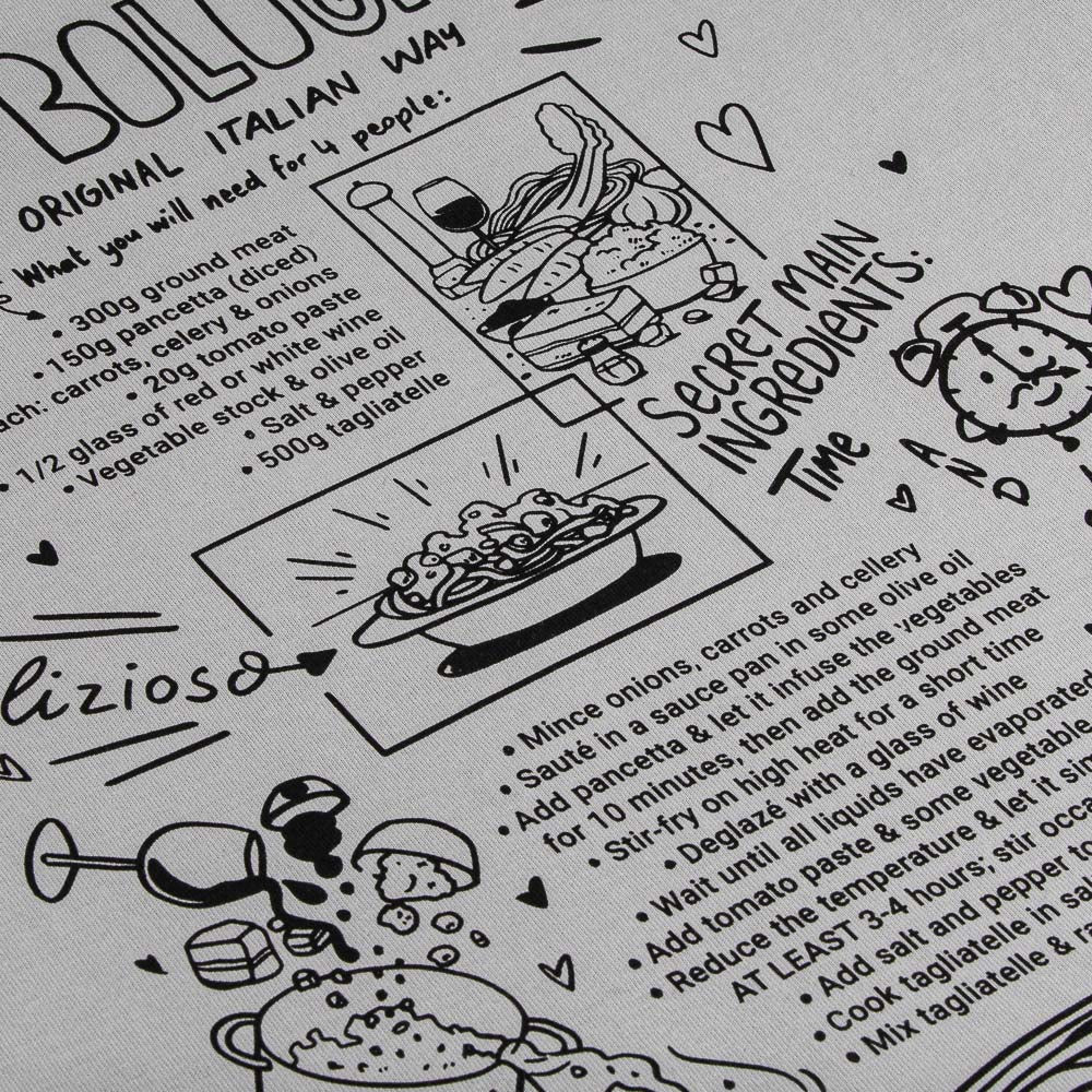 100 % Baumwolle, 240 g/m² Jersey – cozy genug, um 4 Stunden Soße zu rühren.